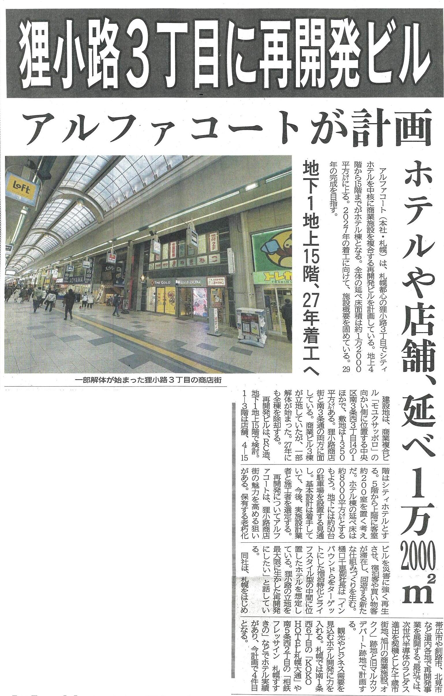 狸小路3丁目に再開発ビル アルファコートが計画 ホテルや店舗、延べ1万2000㎡