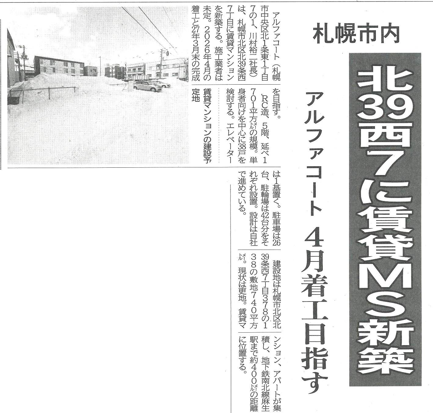 北39西7に賃貸MS新築 アルファコート4月着工目指す